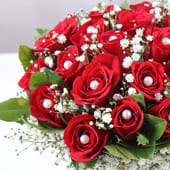 Each red Valentine rose is a declaration of love, its velvet petals kissed by a delicate pearl at its centre. The roses nestle gently among sprigs of gypsophila, soft whispers of affection that seem to linger in the air. The rustic brown jute wrapping adds a touch of timeless elegance, grounding the bouquet in understated beauty. Tied with a ribbon, this creation holds the promise of devotion, a gesture of passion that transcends time and words. A true token for those who wish to convey love without uttering a single syllable.
