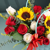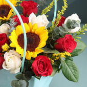 A stunning flower arrangement that radiates warmth and elegance. Bright sunflowers bring a cheerful glow, while red roses add passion, and white roses lend a soothing charm. Thoughtfully arranged in a conical mint green basket and finished with a red ribbon, this floral beauty is perfect for expressing love, gratitude, or heartfelt wishes. Be it birthdays, anniversaries, or festive celebrations, this basket of flowers makes a perfect gift for every occasion and makes it feel more special and full of joy.
