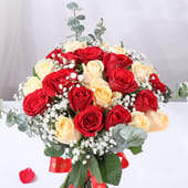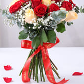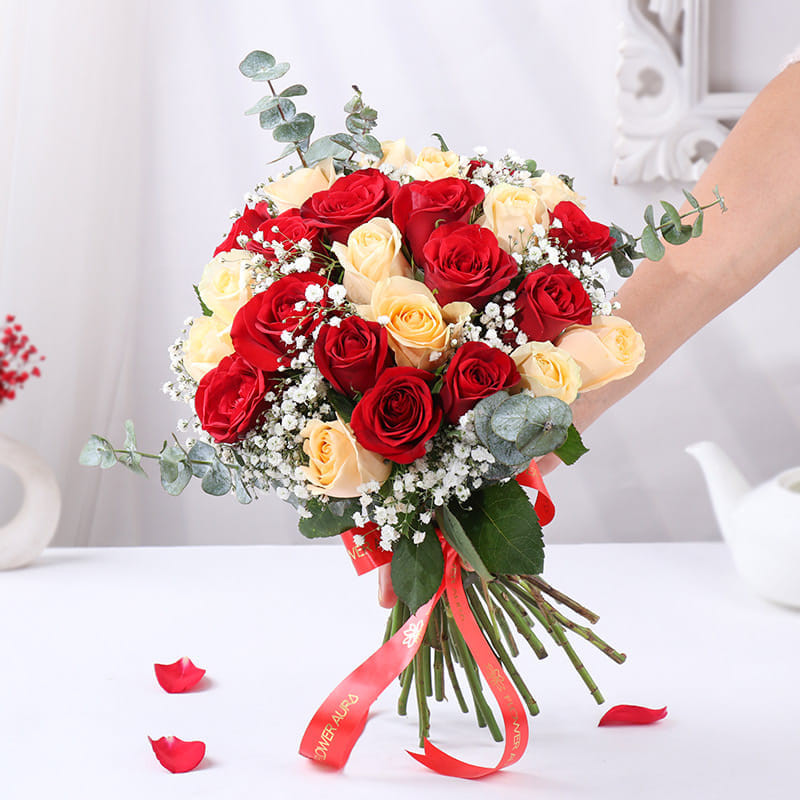 A bouquet where colours come together to tell a story of love and admiration. Deep red Valentine roses speak of passionate devotion, while the soft peach roses add a gentle, tender touch, like whispered words of affection. Sprigs of gypsophila surround the blooms, their delicate beauty as light as a shared secret, while eucalyptus brings an earthy fragrance that grounds the romantic energy. Tied with a ribbon, this bouquet is a declaration of love that deepens with every petal, every moment shared. Perfect for those who want their feelings to blossom in the most beautiful way.
