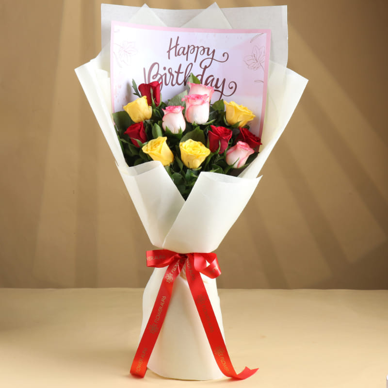 A colorful blend of 12 mixed roses combined with a birthday greeting sheet brings joy, warmth, and festive energy. Ideal for friends, family, or partners, this vibrant bouquet makes any birthday feel extra special. It’s a cheerful gift full of color and positivity.