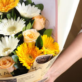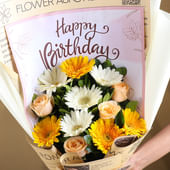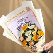 Bright, cheerful, and full of birthday joy, this bouquet brings together yellow and white gerberas with soft peach roses, creating a lovely mix of freshness and warmth. The blooms are paired with a charming birthday sheet that adds a personal, celebratory touch. Wrapped in off-white non-woven paper and a stylish newspaper layer, the bouquet has a modern yet heartfelt appeal. Finished with a neat ribbon, it makes a thoughtful and uplifting way to wish someone a truly happy birthday.