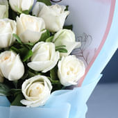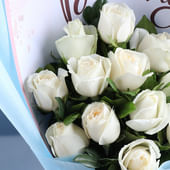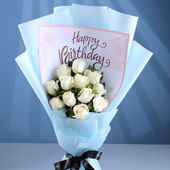 Twelve white roses take the spotlight in this elegant birthday bouquet, offering a calm, uplifting charm from the very first glance. The blooms are gathered together and wrapped in soft blue paper, creating a gentle contrast that makes the flowers look even more refined. The arrangement feels polished and thoughtfully put together. A birthday sheet is tucked inside, adding a celebratory note that completes the gesture with warmth. Ideal for wishing your loved ones a Happy Birthday, this bouquet promises joy and smiles.