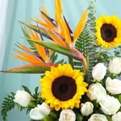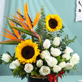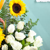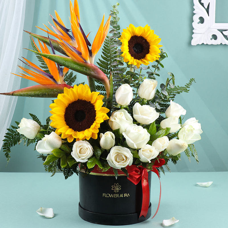 Sunshine and love in every bloom, this exquisite arrangement of 16 white roses, 2 sunflowers, and 2 bird of paradise flowers, alongside fresh eucalyptus, creates the perfect romantic gesture. The elegant black box adds sophistication, making it the ideal choice for Valentine flowers, combining the purity of roses with the vibrancy of sunflowers to express your love. Its stunning beauty and vibrant colours will make a lasting impression, bringing warmth and joy to your special someone on this unforgettable occasion.