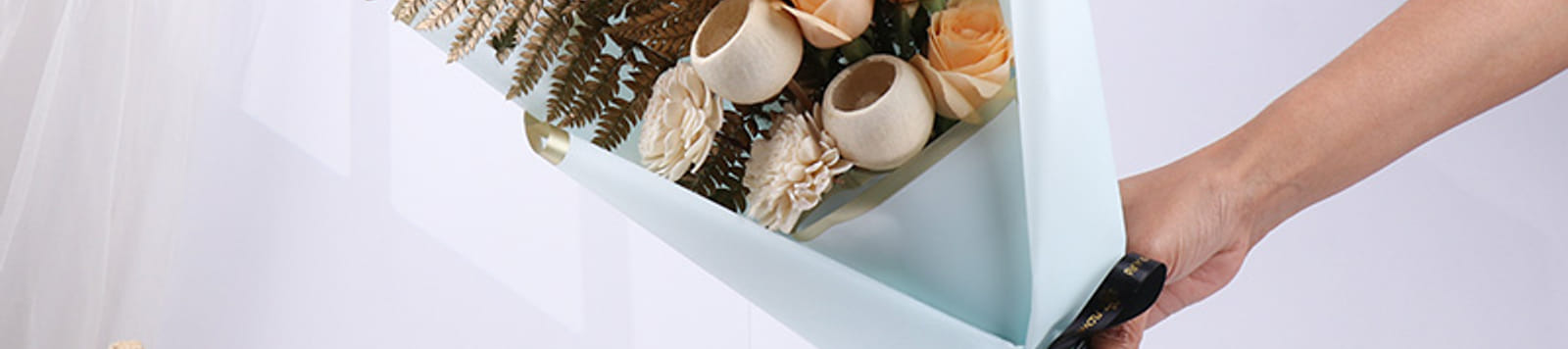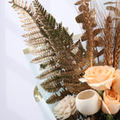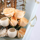 Soft tones meet subtle elegance in this thoughtfully arranged bouquet designed to bring calm and charm into any moment. Featuring peach-toned blooms paired with delicate whites and textured dried accents, the arrangement creates a balanced, soothing visual appeal. Wrapped in premium blue paper and tied neatly, it feels refined yet warm. Perfect for birthdays, housewarmings, or simple gestures of appreciation, this bouquet carries a quiet grace. A beautiful choice when words feel less, but emotions deserve to be expressed with care and style.