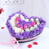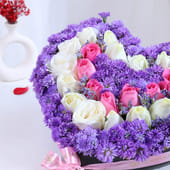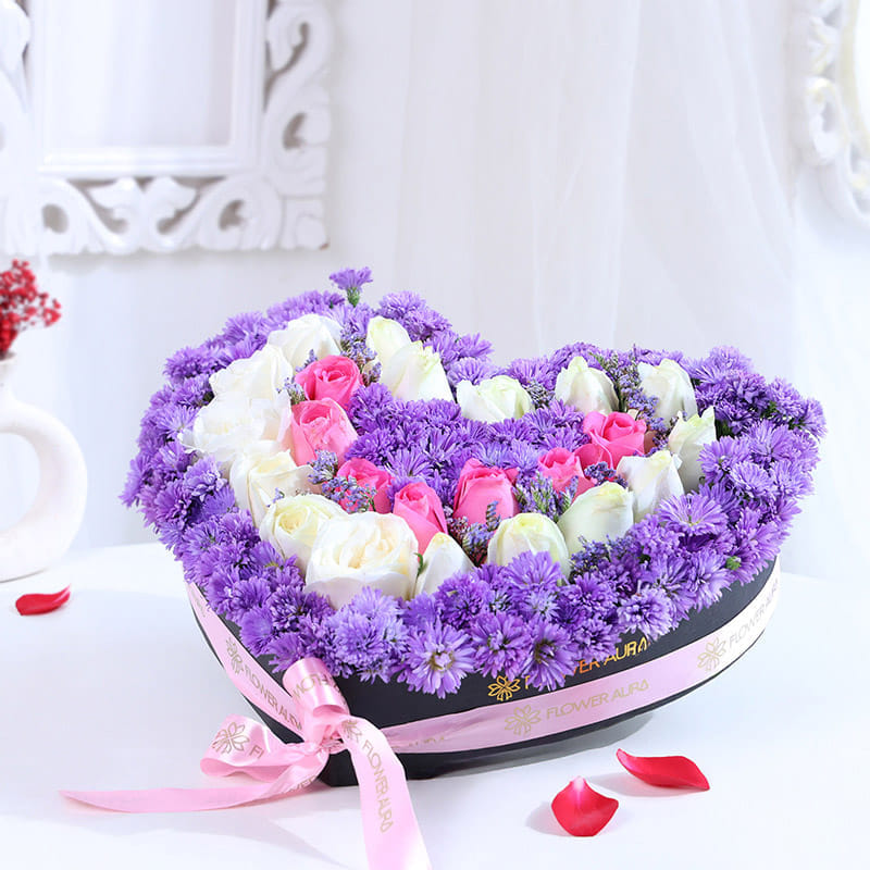 Set in a heart-shaped box, this floral arrangement captures romance in its most graceful form. Soft pink roses speak of tender affection, white roses add calm sincerity, while blue local daisies bring depth and quiet charm. Layered thoughtfully, each bloom complements the other, creating a visual story that feels gentle yet expressive. Ideal for romantic gestures, occasions like Valentine’s Day, or meaningful surprises, this Valentine flower arrangement leaves a lasting impression long after the moment has passed.