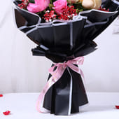 This exquisite bouquet brings together the delicate beauty of revival pink roses, the soft charm of peach roses, and the vibrant contrast of red gypsophila, all elegantly wrapped in black premium paper. The combination of these flowers creates a stunning visual masterpiece, symbolising grace, admiration, and love. Ideal for romantic occasions, this Valentine bouquet is perfect for anniversaries, Valentine's Day, heartfelt moments like Propose Day, or simply to surprise someone special with a gift that radiates warmth and affection. A timeless gesture that speaks volumes without words.
