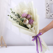 Grace meets gentle charm in this beautifully composed bouquet that blends soft whites with hints of lilac for a soothing visual appeal. The delicate arrangement, accented with textured greens and dried elements, creates a look that feels both fresh and timeless. Wrapped in elegant white non-woven paper and finished with a subtle ribbon, it carries a refined yet heartfelt presence. Ideal for birthdays, anniversaries, or thoughtful surprises, this bouquet expresses emotions with quiet beauty, making every moment feel a little more special and remembered.