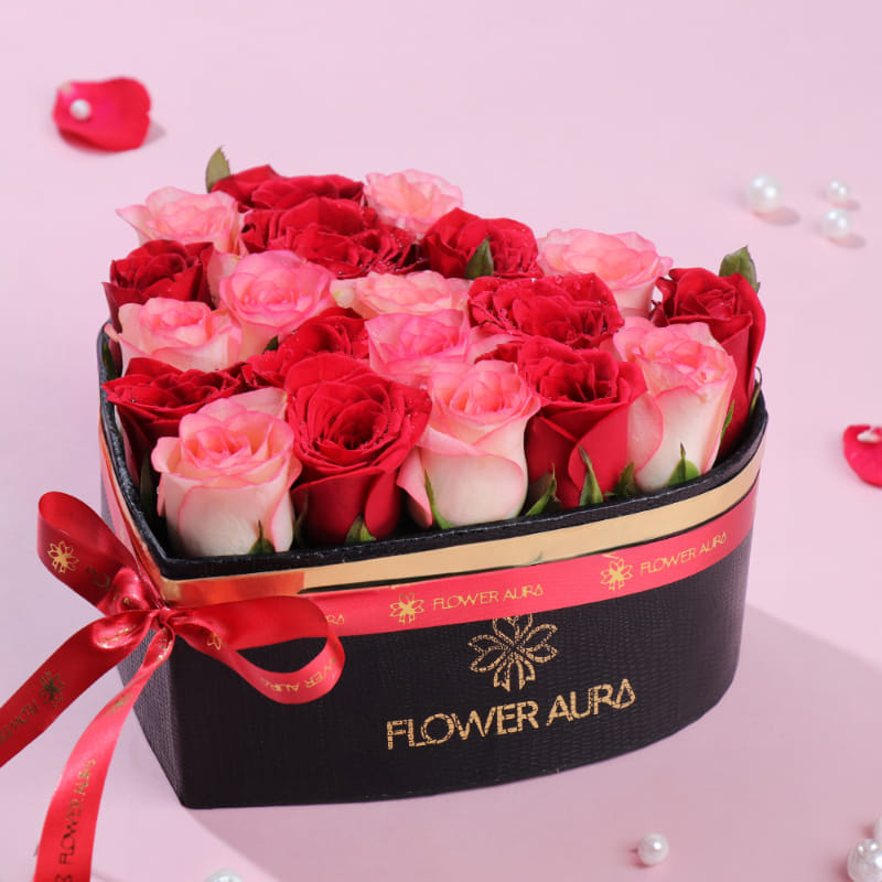 A romantic blend of pink and red roses arranged in a lovely heart-shaped box, symbolizing affection and tenderness. Perfect for anniversaries, birthdays, or romantic surprises, it creates a warm and loving impression. A charming bouquet that beautifully expresses emotion.