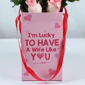 Celebrate the woman who makes your world brighter with this charming floral box of 10 soft pink roses. Nestled neatly in a blush pink box that reads 'I am Lucky to Have a Wife Like You', each bloom speaks of admiration, gratitude and lasting love. The delicate petals and gentle fragrance create a moment she will want to pause and savour. Perfect for anniversaries or a simple surprise, this elegant arrangement turns heartfelt words into a beautiful keepsake she will treasure long after the roses have bloomed.