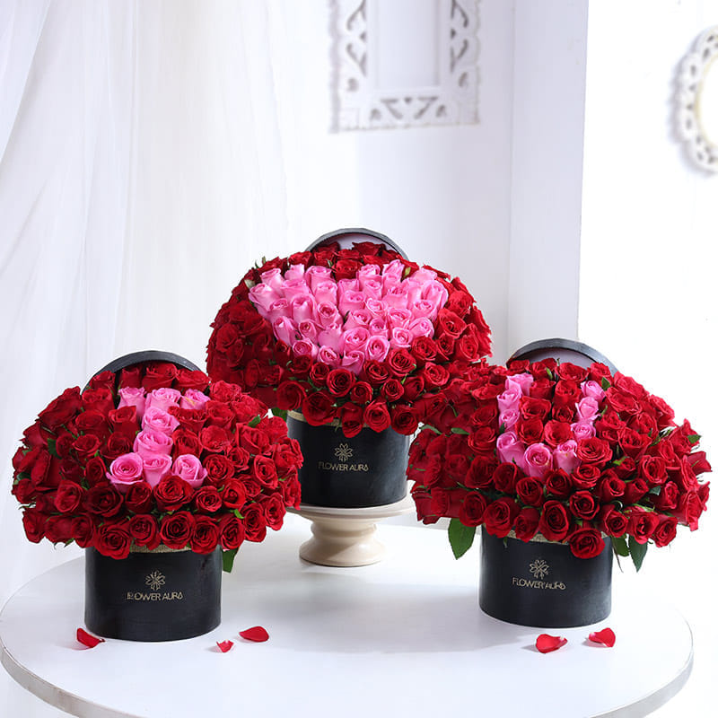 A trio of love captured in Valentine roses, where passion and tenderness intertwine in perfect harmony. The deep red roses reflect a love that’s bold, fierce, and everlasting, while the soft pink roses bring a sense of serenity and gentle affection. Set in elegant black boxes, these beautiful arrangements form a heart of devotion. Each bouquet holds a silent promise, each petal a piece of your heart. A gift designed to leave a lasting impression, perfect for the one whose love fills your every moment.