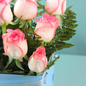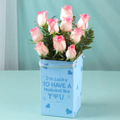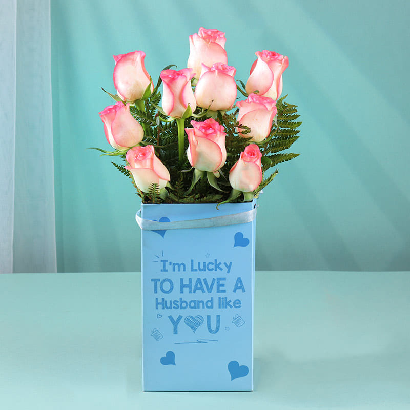 Ten delicate pink roses bloom beautifully in a charming blue floral box that reads, “I’m Lucky to Have a Husband Like You.” Soft petals meet fresh green foliage, creating a graceful display that feels both heartfelt and refined. Designed to speak straight from the heart, this love rose flower arrangement turns simple emotions into something visible and lasting. A thoughtful gesture for anniversaries, birthdays, or just because he deserves to be reminded how deeply he’s cherished.