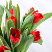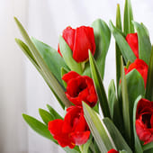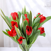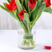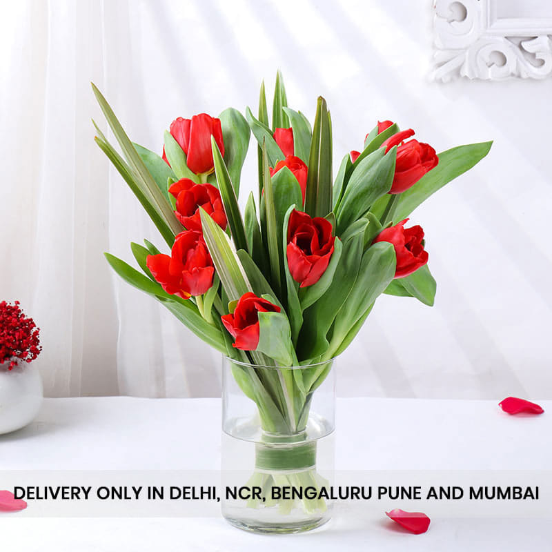 Vibrant red tulips, elegantly arranged in a clear cylinder vase, create a striking display of love and beauty. The lush green stems complement the rich red petals, symbolising deep affection and passion. With their graceful curves and bold colour, these tulips make a stunning addition to any romantic occasion, such as Valentine’s Day or an anniversary. The simplicity of the design, paired with the timeless beauty of the tulips, ensures that this bouquet is a perfect way to express love and admiration, leaving a lasting impression with every glance. Price Breakup: Bouquet Of Passionate Tulips ₹6245, Glass Vase ₹150