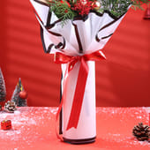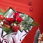 Bring home the spirit of Christmas with this striking red rose bouquet, adorned with lush greens and festive ornament accents. Wrapped in premium white and black-edged paper, the arrangement reflects elegance and holiday cheer. Perfect for expressing love, gratitude, or festive joy, this bouquet adds warmth and charm to every Christmas celebration.