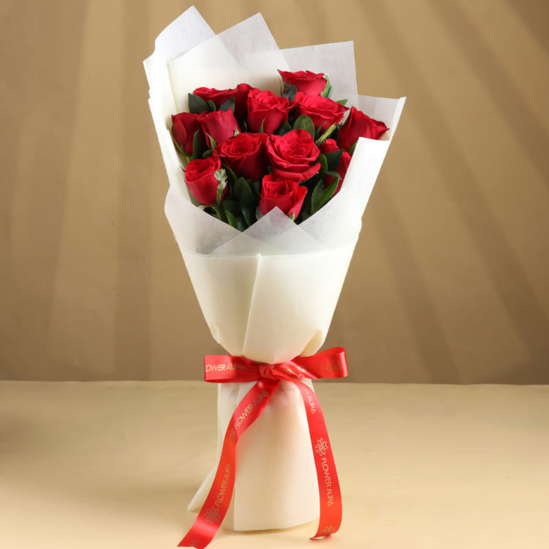 Twelve rich red roses wrapped in elegant non-woven paper create a timeless and romantic bouquet. Perfect for anniversaries, love notes, or heartfelt expressions, it carries classic charm. A beautiful and meaningful choice for anyone you hold dear.