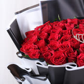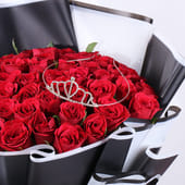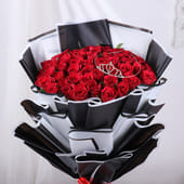 Make a striking romantic statement with this luxurious bouquet of 50 radiant red roses, elegantly wrapped in premium black and white paper and finished with a delicate tiara for a regal touch. Perfect for Valentine’s Day, proposals, or any heartfelt celebration, this bouquet speaks without words. Let your emotions bloom beautifully with this timeless expression of love, designed to impress and remembered as unforgettable valentine roses.