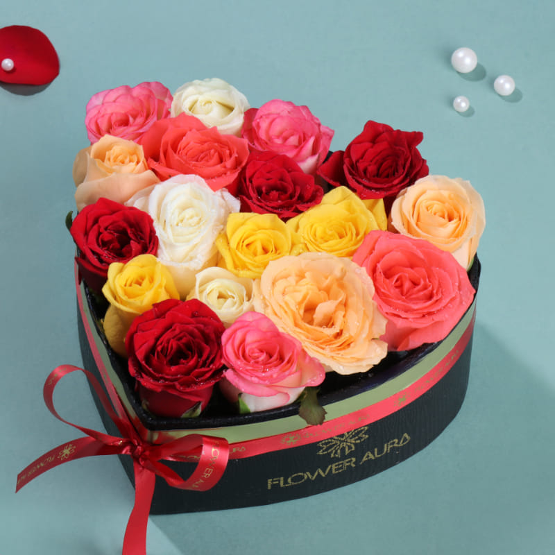 This vibrant heart-shaped bouquet features 18 mixed roses in lively, uplifting shades. Perfect for cheerful celebrations, joyful surprises, or expressing warm feelings, it brings color and happiness to any moment. A beautiful way to celebrate life’s brightest occasions.