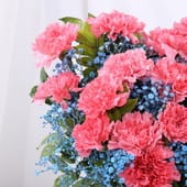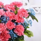 A beautiful blend of light pink carnations and blue gypsophila creates an arrangement that exudes grace and tenderness. Set in a glass vase, this elegant Valentine flower arrangement is designed to captivate the heart and soothe the soul. The delicate pink carnations symbolise love and admiration, while the subtle blue gypsophila adds a touch of charm and lightness. Perfect for romantic occasions, this arrangement makes a heartfelt gift, whether it's an anniversary, Valentine's Day, or any special moment you wish to celebrate with love and affection. Price Breakup: Delicate Harmony Of Pure Elegance ₹1295, Glass Vase ₹150