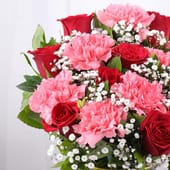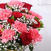 A stunning expression of love and admiration, this Valentine bouquet features a beautiful mix of red roses and light pink carnations, thoughtfully arranged in an elegant Teleflora vase. The deep red roses speak of passionate love, while the soft pink carnations add a touch of sweetness and tenderness. Nestled in a charming vase with a rustic twine bow, this arrangement is perfect for romantic occasions. Whether for an anniversary, Valentine’s Day, or simply to surprise someone special, this bouquet is sure to convey your heartfelt emotions with grace and elegance. Price Breakup: Echoes of Blooms Blushing In Love ₹1295, Glass Vase ₹150