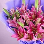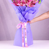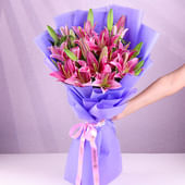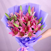 A dazzling display of beauty, this bouquet brings together twelve pink lilies, each bloom unfolding with charm and grace. Nestled in soft purple paper, the arrangement exudes elegance and sophistication. The lilies, with their vibrant petals and fresh green buds, offer a refreshing aura and a fragrance that uplifts the senses. Their appearance is both bold and delicate, making this bouquet an ideal expression of admiration, love, or heartfelt wishes. Perfect for grand gestures and memorable occasions, it promises to bring a smile to your loved ones' faces.
