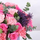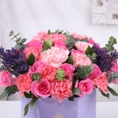 This enchanting bouquet features 15 revival pink roses and 15 light pink carnations, complemented by the elegance of limonium and eucalyptus, all nestled in a charming purple box. The soft hues of pink and delicate greens create a harmonious and graceful arrangement, perfect for expressing love, appreciation, or admiration. Whether it's for Women's Day, a birthday, an anniversary, or just to brighten someone's day, this floral masterpiece makes a stunning gift. A beautiful way to celebrate special moments or bring joy to any space.