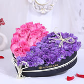 A bold expression of affection, this heart-shaped arrangement pairs soft pink roses with clusters of blue local daisies, creating a striking contrast that feels both romantic and thoughtful. Set in a sleek black heart-shaped box, the blooms speak of tenderness, admiration, and quiet devotion. The roses bring warmth and emotion, while the daisies add depth and charm, making the arrangement feel complete and intentional. Perfect for moments when words fall short, these Valentine flowers capture love in its purest, most heartfelt form.
