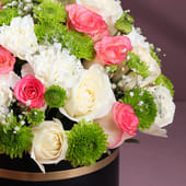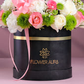 Imagine the moment when someone receives a gift that speaks softly, yet beautifully! That’s exactly what this floral box brings. Green button daisies add a touch of freshness, while pink roses carry a message of warmth and affection. White carnations provide a soft contrast, enhancing the elegance of the arrangement. Nestled in a sleek black box, this bouquet makes a stunning gift for any occasion, turning a simple moment into a cherished one. It’s the kind of gesture that says more than words, offering both beauty and meaning in one thoughtful package.