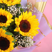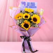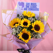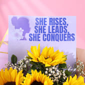 Celebrate her strength, beauty, and grace with this vibrant floral arrangement. The bouquet features five radiant sunflowers, symbolising positivity and resilience. Wrapped in luxurious purple premium paper, this arrangement exudes elegance and warmth. Accompanying the sunflowers is a powerful message: "She Rises, She Leads, She Conquers," printed on an A4 sheet, making it the perfect tribute to the incredible woman in your life. Ideal for expressing admiration, empowerment, and a Women's Day gift, this bouquet is sure to brighten her day and inspire her journey.