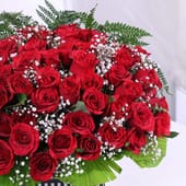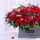 Create cherished memories with your partner with this elegant arrangement, featuring 50 stunning red roses beautifully displayed in a premium black and white box. Surrounded by delicate baby’s breath and fresh green foliage, it exudes sophistication and charm. The contrasting textures and hues complement each other beautifully. Perfect for romantic occasions like Valentine’s Day, it conveys your deepest feelings. These Valentine roses are a great way to stand out and surprise your loved one with an unforgettable gesture.