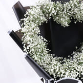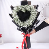 A heart-shaped embrace of delicate gypsos blooms, wrapped in sleek black premium paper, this bouquet is a stunning expression of love. Perfect for Valentine's Day or any moment when words fall short, the soft white gypsos symbolise purity, affection, and timeless beauty. Its heart-shaped design conveys the depth of your feelings, making it an ideal romantic gesture for someone truly special. The sophisticated black wrapping enhances the elegance of this thoughtful gift, turning any occasion into a celebration of love and devotion. Let your heart speak through this beautiful bloom.