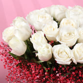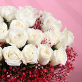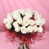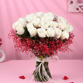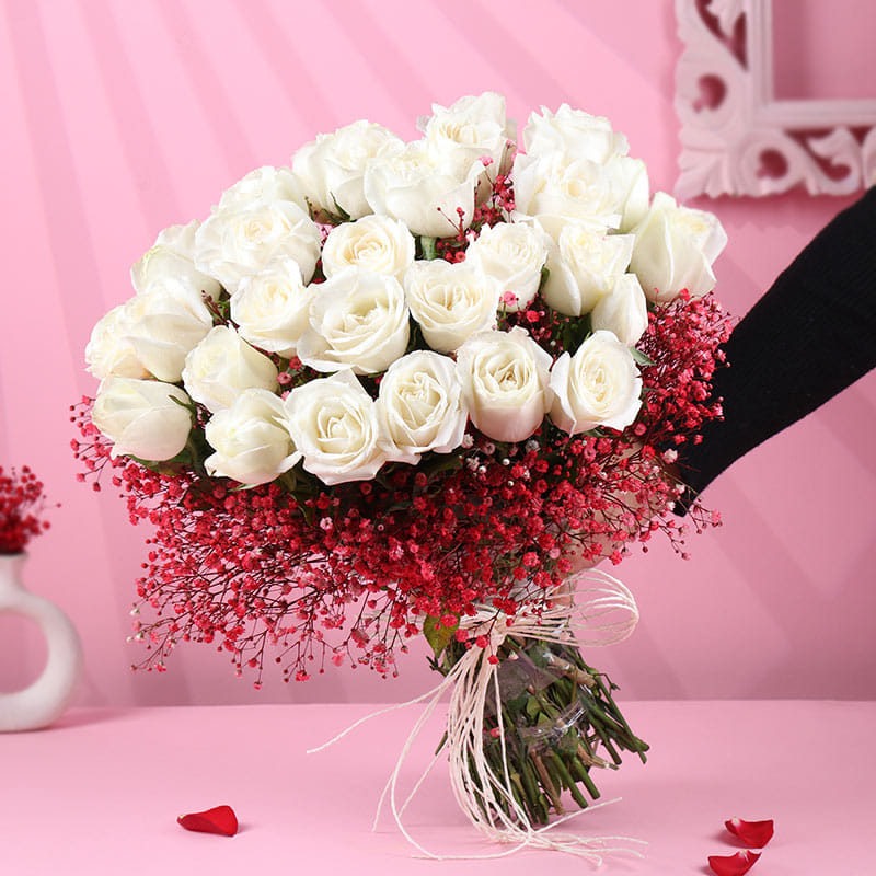 Love speaks the softest language through pure white roses and the gentle, romantic touch of red-sprayed gypsos. They are perfect for Valentine’s Day, anniversaries, or any moment when your heart speaks louder than words. This stunning hand-tied bouquet is a perfect expression of devotion, ideal for a romantic gift that leaves an everlasting impression. The delicate contrast of white and red, with their tender meanings, evokes timeless affection. Wrapped with soft finesse, it is a gift that shows how deeply you care. Let these blooms be the perfect messenger of your love.