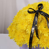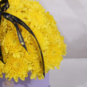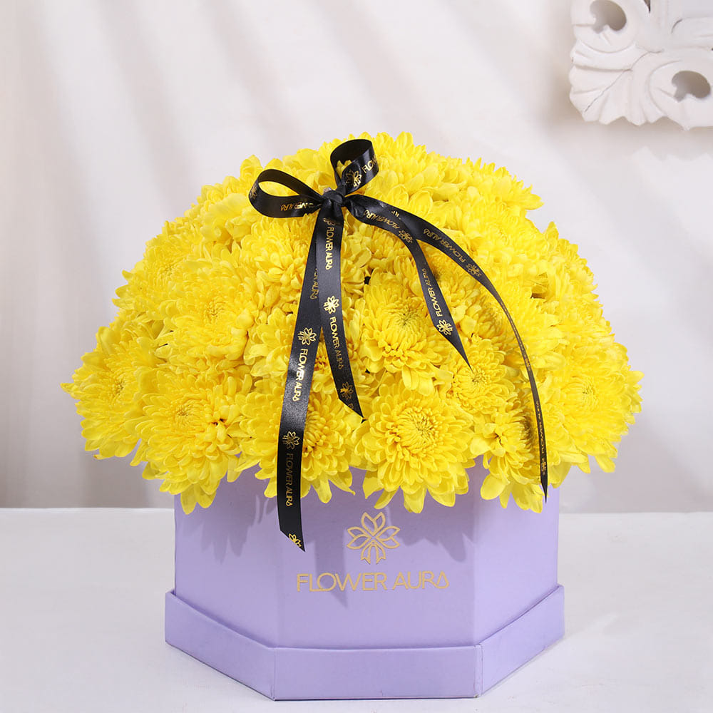 Surprise your loved ones with this radiant floral arrangement featuring 30 yellow chrysanthemums, elegantly arranged in a sleek purple box and finished with a black satin ribbon for a touch of sophistication. The vibrant blooms symbolise joy, positivity, and cheer, making this arrangement perfect for occasions like Women's Day, anniversaries, birthdays, or simply to brighten someone's day. This floral masterpiece is sure to bring warmth and happiness to any space. It’s a thoughtful and stylish gift to express gratitude and admiration.