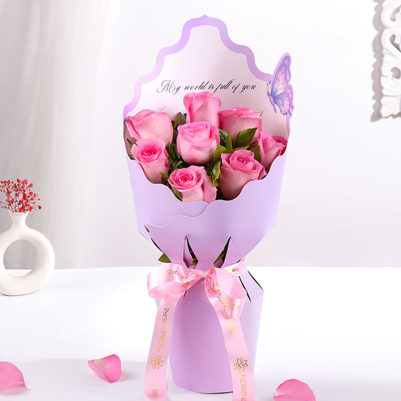 This enchanting bouquet features ten delicate pink roses, gracefully arranged in a soft purple sleeve, tied with a satin ribbon. The gentle pink hues of the roses symbolize admiration, sweetness, and grace, making it the perfect gift to express your love. Ideal for flower gift for Valentine’s Day, Rose Day, anniversaries, or any occasion where you want to convey heartfelt emotions. The elegant packaging and the sentiment behind each bloom make this bouquet a timeless gesture of affection, ideal for celebrating love and special moments.