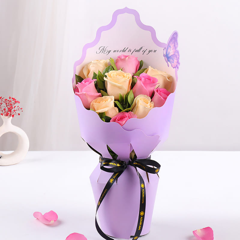A perfect choice for Valentine’s Day, Propose Day, Rose Day, anniversaries, and other moments to celebrate love, this exquisite bouquet features 5 revival pink roses and 5 peach roses. The soft pink roses symbolize admiration and grace, while the peach roses express sincerity and gratitude. Wrapped in a delicate purple sleeve adorned with a butterfly design, this bouquet adds a touch of elegance to any occasion. Tied with a black satin ribbon, it’s a timeless expression of affection, making it the ideal floral gift to convey deep emotions and celebrate love.
