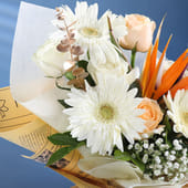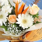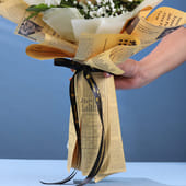 Crafted for moments that call for beauty with intention, this bouquet blends elegance and quiet drama in every stem. Birds of Paradise rise at the centre like bright strokes of colour, surrounded by white gerberas, soft roses and delicate gypsos that bring a gentle charm. Golden eucalyptus adds a touch of refinement, giving the arrangement depth and movement. Wrapped in white non-woven paper and vintage-style newspaper, it feels like a story unfolding in your hands. Ideal for heartfelt gestures, artistic gifting or occasions that deserve something truly distinctive and memorable.