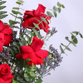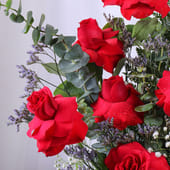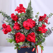 This exquisite arrangement is a heartfelt gift that speaks of love and elegance. Rich red roses, symbolising passion and admiration, are beautifully paired with the refreshing green eucalyptus and delicate fern leaves. All of this is presented in a luxurious, premium blue box, making it a truly sophisticated gesture. Whether you're celebrating love, friendship, or a special milestone, this stunning floral gift will make any occasion unforgettable. It's the perfect way to show someone how much they mean to you with a timeless expression of beauty and grace.