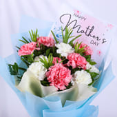 A tender expression of love, this bouquet is filled with soft pink and white carnations, symbolising the beauty of motherhood. Wrapped in serene blue and white non-woven paper, it’s the perfect way to honour your mom on Mother’s Day. Topped with a "Happy Mother’s Day" message, this thoughtful arrangement captures the warmth and affection you feel for her. A gentle reminder of her love and care, this bouquet is the ideal gift to brighten her day and celebrate the extraordinary woman she is.