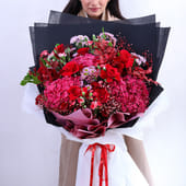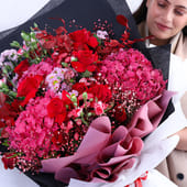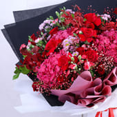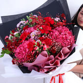 An exquisite arrangement that speaks the language of love, this bouquet is an embodiment of romance and elegance. The rich tones of Red Hydrangeas, Red Roses, and Santini Chrysanthemums blend seamlessly with delicate Spray Carnations and the subtle touch of Gypso. Wrapped in a luxurious combination of black and white paper, finished with a satin red ribbon, this breathtaking bouquet is the ultimate gesture for any romantic occasions, like anniversaries, Valentine’s Day, celebrating a milestone or simply cherishing someone special in the most heartfelt way.