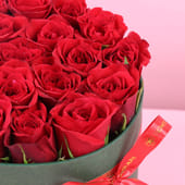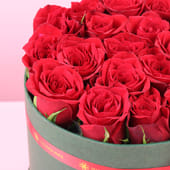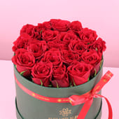 Let passion bloom unapologetically with this stunning collection of twenty lush red roses, perfect for Valentine's Day and every moment deserving of grand romantic gestures. Arranged in a sophisticated sage-green cylindrical box and finished with a graceful ribbon, this arrangement radiates timeless elegance and bold devotion. Each velvety crimson petal whispers of desire, admiration, and unwavering love. Whether declaring your love or simply celebrating the one who makes your world brighter.