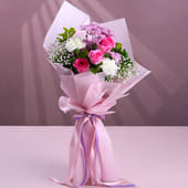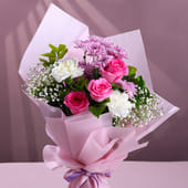 A charming bouquet crafted to bring a smile at first sight. This arrangement features two pink roses, two white carnations, and delicate purple daisies, all gathered with lush greens for a balanced and graceful look. Wrapped in pink paper and finished with pastel ribbons, the bouquet carries a gentle, heartfelt feel that works beautifully for birthdays, anniversaries, congratulations, or simple gestures of care. Its mix of colours offers freshness without being overwhelming, making it a lovely choice for surprising your loved ones.