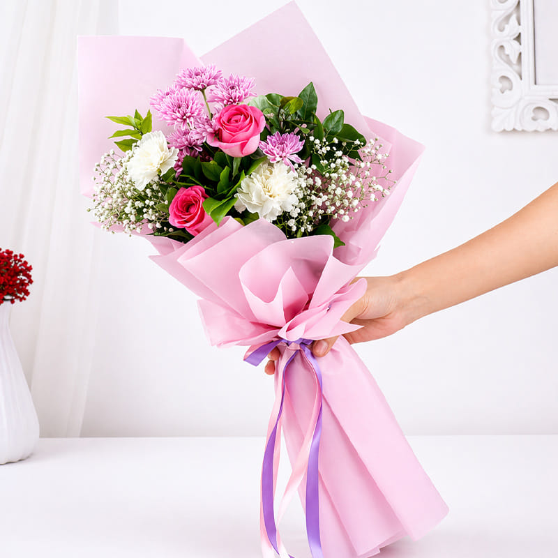 A charming bouquet crafted to bring a smile at first sight. This arrangement features two pink roses, two white carnations, and delicate purple daisies, all gathered with lush greens for a balanced and graceful look. Wrapped in pink paper and finished with pastel ribbons, the bouquet carries a gentle, heartfelt feel that works beautifully for birthdays, anniversaries, congratulations, or simple gestures of care. Its mix of colours offers freshness without being overwhelming, making it a lovely choice for surprising your loved ones.