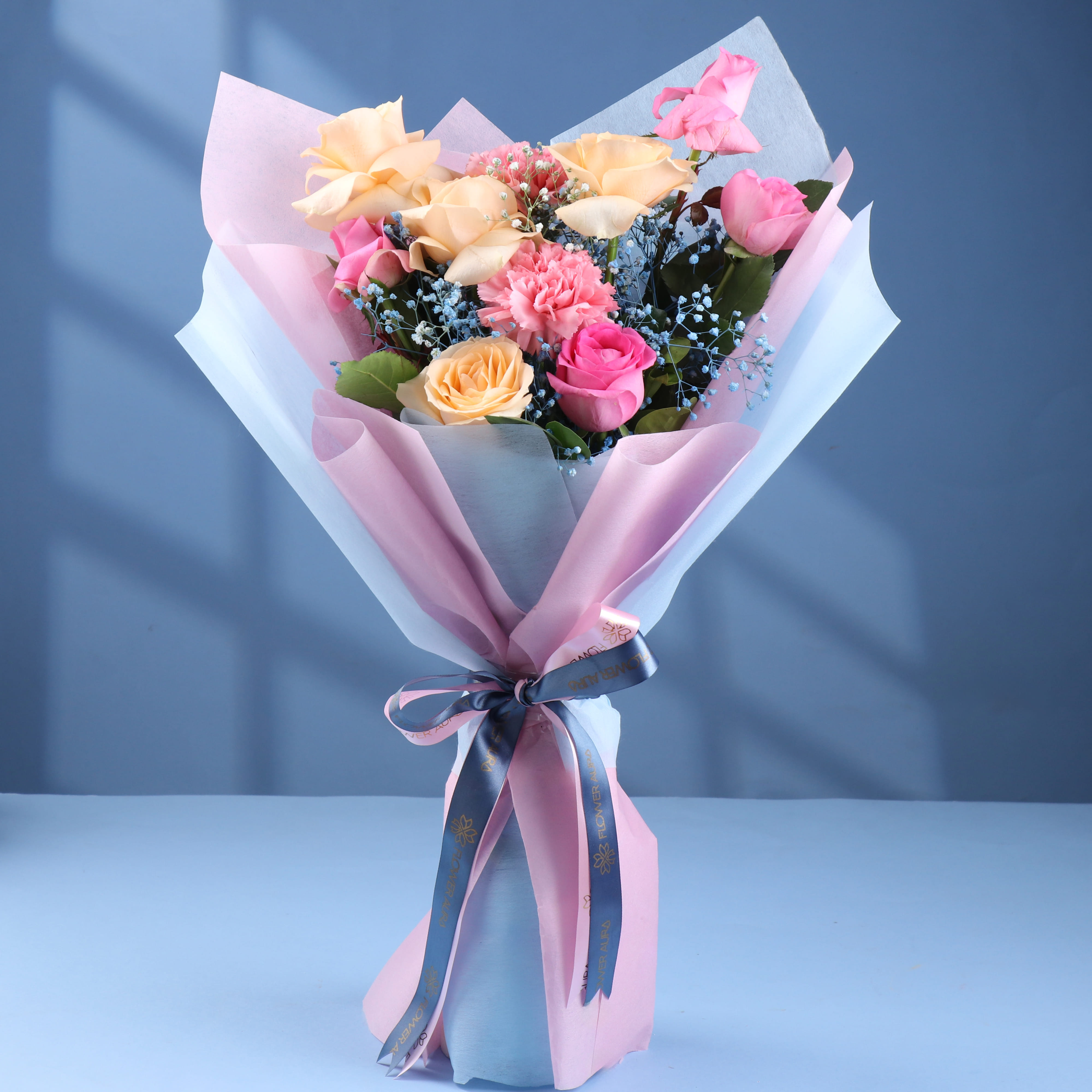 Brighten any occasion with this radiant bouquet of 4 pink roses, 4 peach roses, and 2 delicate pink carnations. Wrapped in light pink non-woven paper, this arrangement embodies elegance and cheerful beauty. Perfect for birthdays, thank-you gestures, or celebrations, it expresses warmth, affection, and joy. Its soft, harmonious colors make it a versatile and captivating gift for anyone special.