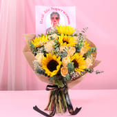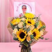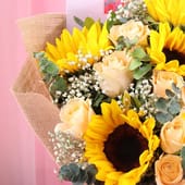 Celebrate the real-life superwomen in your life with this vibrant bouquet, perfect for Women’s Day or Mother’s Day. Featuring six radiant sunflowers and fifteen soft peach roses, all wrapped elegantly in jute, this arrangement radiates warmth, joy, and gratitude. It’s an ideal way to show appreciation for the women who inspire strength, beauty, and grace every day. Whether it's a special occasion or just because, this bouquet makes for a memorable gift that speaks volumes.