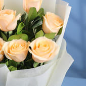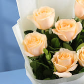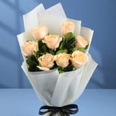 A bouquet that feels as gentle as its colour, crafted to bring calm, warmth, and quiet joy to any setting. These peach roses offer a soft, graceful charm, perfect for thoughtful moments and heartfelt gestures. Wrapped in off-white non-woven paper, the bouquet carries a clean, elegant look that lets the blooms shine. Whether you’re expressing care, marking a milestone, or sending a little light someone’s way, this arrangement adds a soothing touch that feels personal, warm, and beautifully timeless.