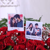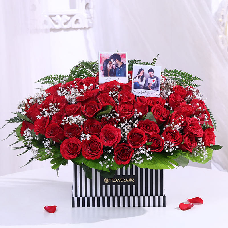 Express your love in the most memorable way with this arrangement of 50 red roses, beautifully arranged in a sleek black-and-white box. What truly sets it apart are the two personalised photos, capturing moments that speak directly to the heart. The delicate touch of baby’s breath and lush greenery adds a graceful finish, making this bouquet more than just flowers—it becomes a messenger of your affection. Perfect for Valentine’s Day, it’s designed to evoke lasting memories and emotions. These Valentine roses are sure to make your gesture unforgettable.