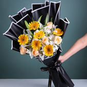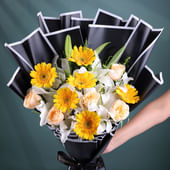 A vibrant expression of joy and elegance, this bouquet beautifully combines 5 peach roses, 6 bright yellow gerberas, and 5 pristine white lilies. Wrapped in striking black premium paper and tied with a sleek ribbon, it creates a dramatic contrast that feels both modern and sophisticated. The peach roses bring warmth and admiration, the gerberas radiate happiness, while the lilies embody grace and serenity. Together, they weave a story of affection, positivity, and charm. Perfect for birthdays, congratulations, or celebrations, this bouquet is a thoughtful gesture that leaves a lasting impression of cheer and heartfelt emotion.