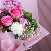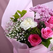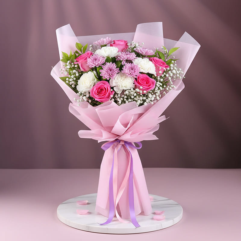 Celebrate love, gratitude, and special moments with this beautifully handcrafted bouquet featuring fresh pink roses, delicate white carnations, soft chrysanthemums, and baby’s breath accents. Wrapped in premium blush pink paper and finished with a graceful satin ribbon, this arrangement radiates elegance and charm.