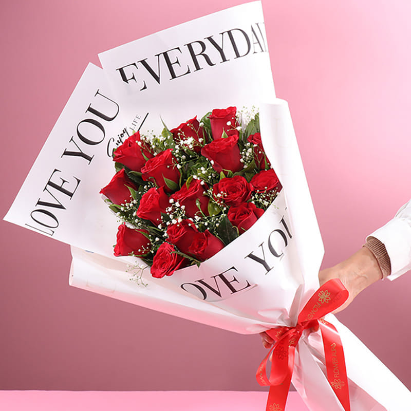 Express your deepest emotions with this breathtaking bouquet of fifteen red roses, a symbol of unwavering love and devotion. Wrapped in premium white paper with the heartfelt message “LOVE YOU EVERYDAY,” this arrangement makes a perfect gift for Valentine’s Day, Rose Day, or Propose Day. The vibrant red roses, accompanied by delicate baby’s breath, radiate passion and tenderness, while the red ribbon adds a touch of elegance. This beautiful bouquet is the perfect way to say "I love you" and create unforgettable moments with someone special.