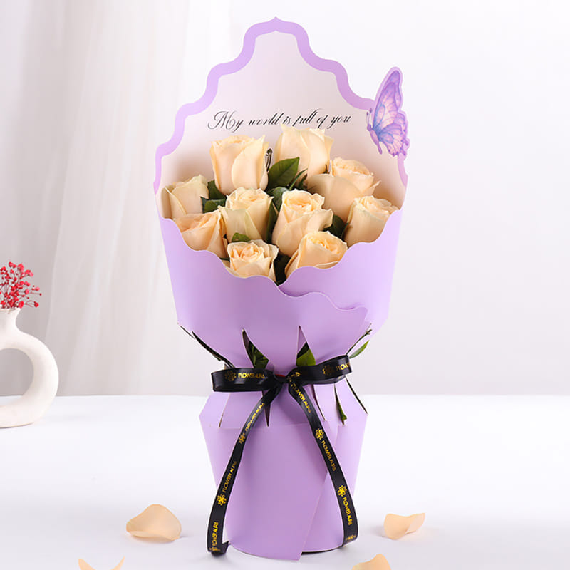 A heart-winning floral gift for Valentine’s Day and other moments like Rose Day or Propose Day, this bouquet of ten delicate peach roses in a soft purple sleeve speaks of warmth, admiration, and tender affection. Each rose, with its subtle hue, is a quiet whisper of love and a promise of devotion. Tied with a satin black ribbon, this elegant arrangement is the perfect way to express emotions that words cannot capture. Whether it's a celebration of love or a heartfelt gesture, these roses are the perfect messenger for every cherished moment.