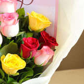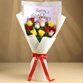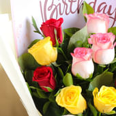 Bright mixed roses come together beautifully in this joyful birthday bouquet. The arrangement includes twelve fresh blooms in red, yellow and soft pink, creating a warm and lively colour story. Each rose stands out against the white wrapping, giving the bouquet an elegant and polished finish. A birthday sheet is placed inside to add a thoughtful, personal touch that makes the gesture feel even more special. Perfect for surprising someone on their big day, this bouquet blends colour, freshness and heartfelt sentiment in a way that instantly lifts the mood.