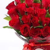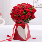 Convey your love and care on occasions like Valentine’s Day with this stunning arrangement. It boasts twenty-four red roses beautifully arranged in a box with a heart design. With its eye-catching packaging and elegant ribbon, this gift exudes warmth and affection, making it ideal for celebrating cherished moments. It will surely make your partner smile and feel valued, strengthening your bond. This thoughtful gesture promises to help you create lasting memories that you will reminisce about forever.